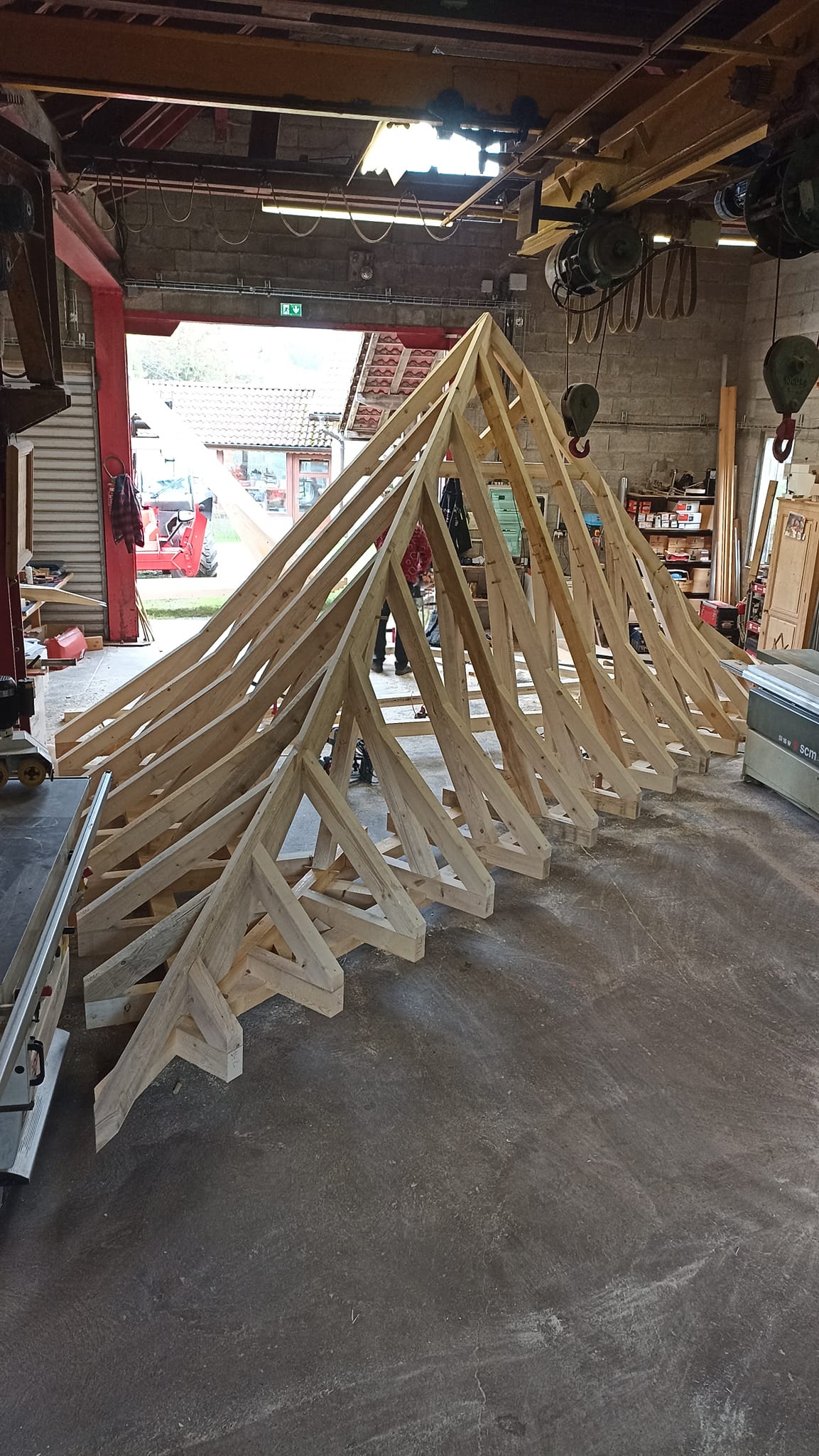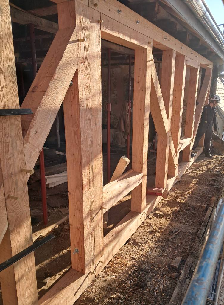 Des travaux de charpente et de couverture sont réalisés sur des bâtiments anciens en utilisant des techniques adaptées au patrimoine.